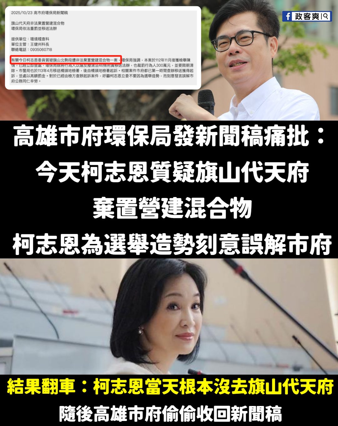 今天上午十一點,陳其邁的高雄市府環保局,發了一篇「柯志恩委員質疑旗山代天府棄置營建混合物」新聞稿,結果柯志恩今天根本沒去過旗山代天府。