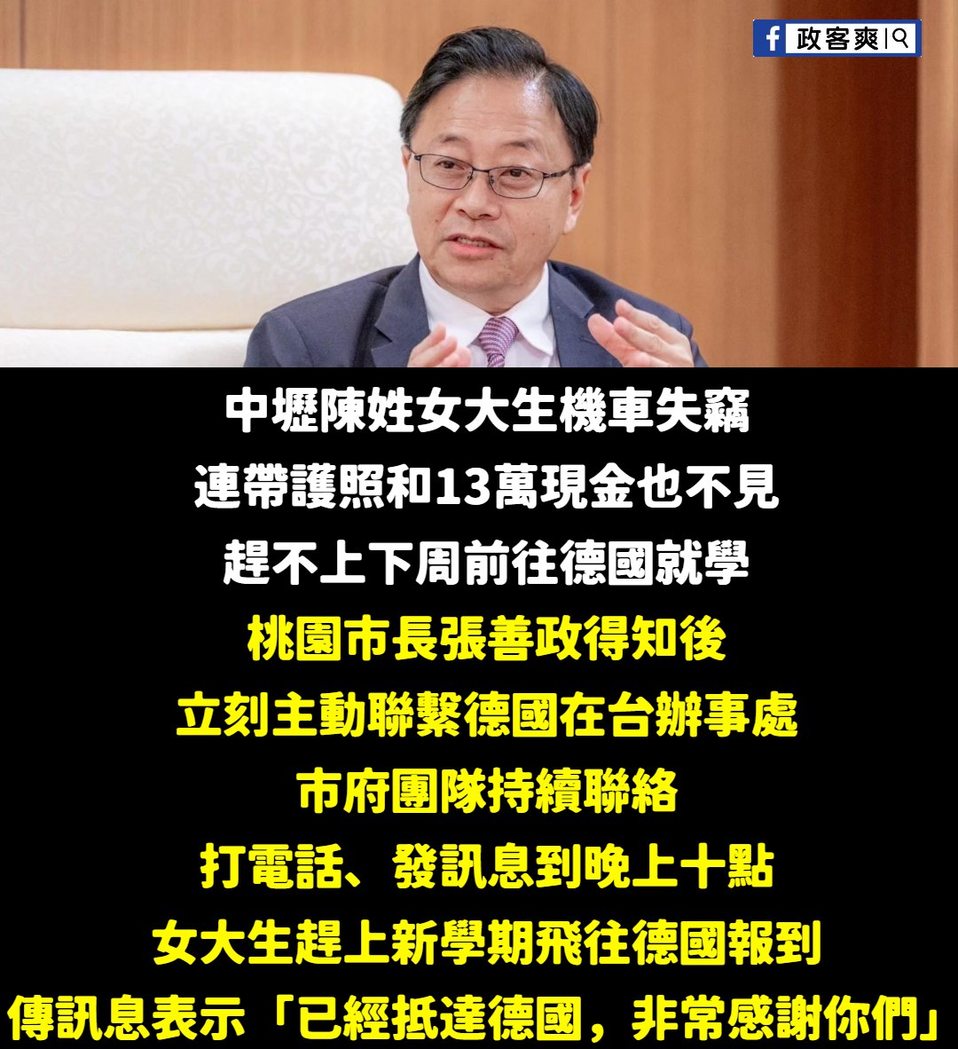 市長張善政得知後,立即指示市府團隊展開協助,主動聯繫德國在台辦事處,也透過駐德大使谷瑞生協助關注。一位參與協調的官員透露,女大生護照與簽證遭竊的消息傳出後,幾名局長正好在府層辦公室開會,話題立刻轉向:「誰手上有管道可以幫忙?」