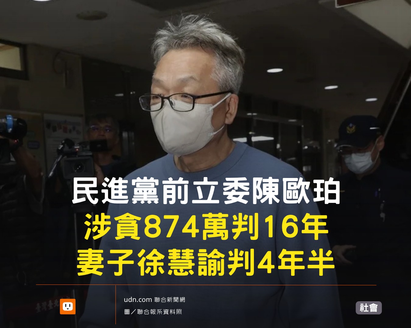 陳歐珀判處有期徒刑16年,褫奪公權6年。 【民進黨前立委陳歐珀涉貪874萬判16年 妻子徐慧諭判4年半】