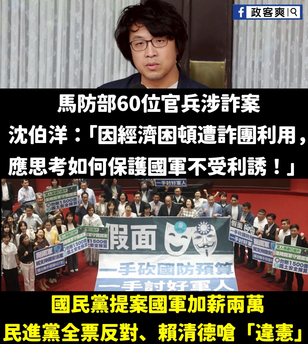 雙標自打臉的民進黨,最愛扯國軍後腿 馬祖地區驚傳逾60名士官兵將銀行帳戶提供給詐騙集團使用的不法事件,民進黨立委沈伯洋表示:「#因經濟困頓遭詐團利用,類似情境屢見不鮮,#應思考如何保護國軍不受利誘。」 啊國民黨之前提幫國軍加薪兩萬,民進黨全票反對,賴清德還發臉書嗆「在程序上有違憲疑慮」,扯後退的是你們,說要保護國軍的也是你們。 當時還忙著大罷免大成功,所有藍白提案通通反對,笑死人。 轉載來源
