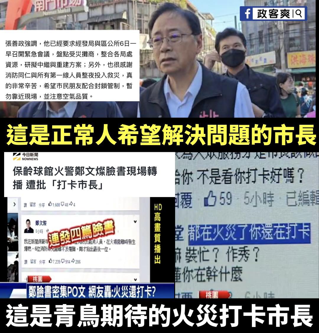 青鳥一直強調市長張善政應該去火災現場,那只好搬出2015年被罵爛的「打卡市長鄭文燦」