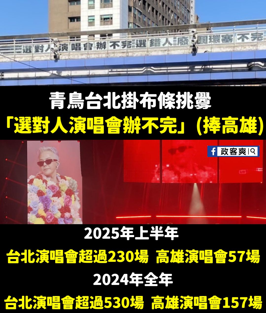 青鳥認證「台北市長蔣萬安選對人」 有青鳥跑去天橋拉布條表示「選對人演唱會辦不完」 根據數據統計: 2025年上半年 台北演唱會超過230場 高雄演唱會57場 2024年一整年 台北演唱會超過530場 高雄演唱會157場 台北的演唱會明顯全台最多,看來市長選對人真的演唱會辦不完 在社群狂洗高雄演唱會多厲害的氛圍下,還願意說實話不容易,這一看就是查好數據才掛的布條 轉載來源