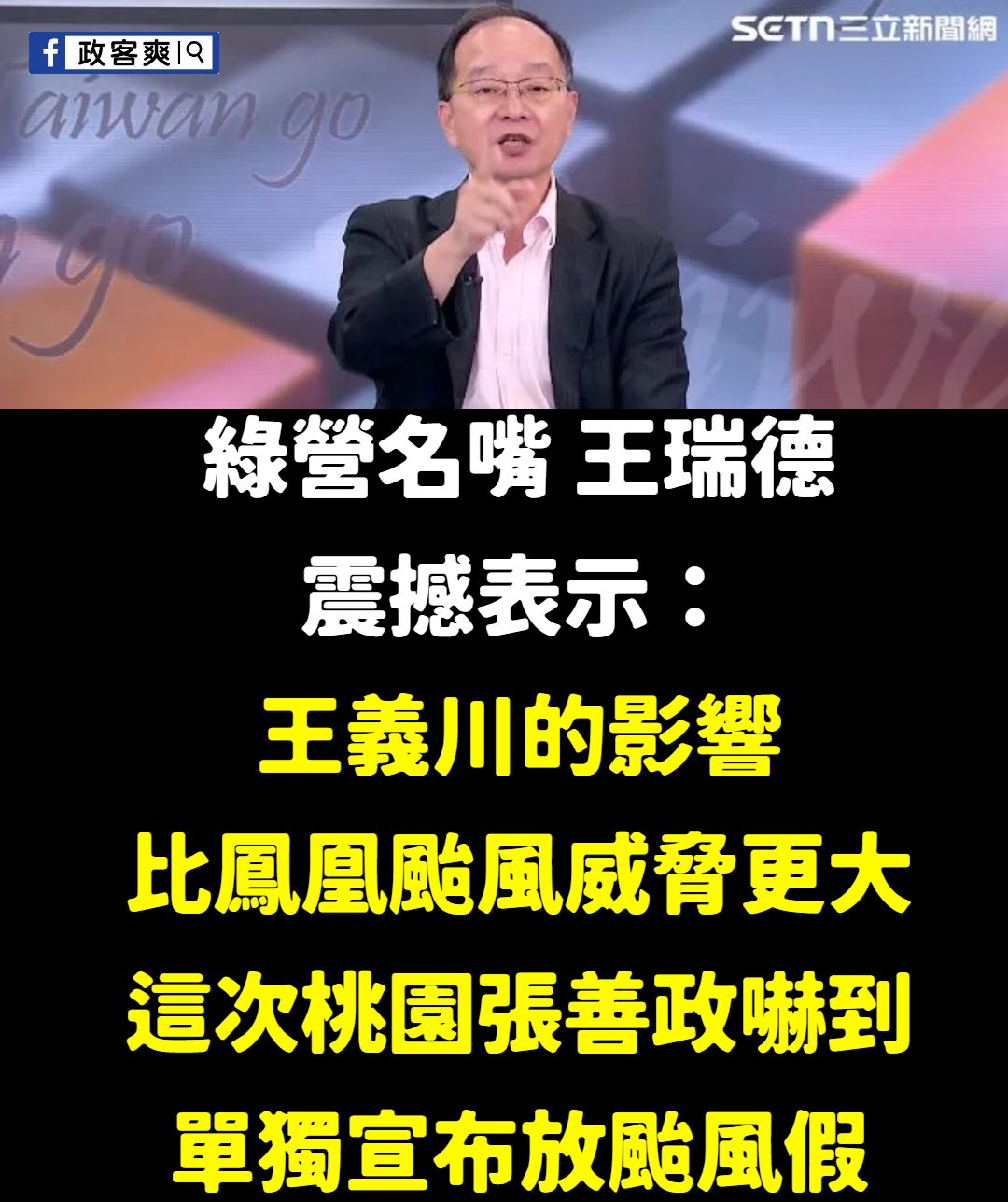 非常認同王瑞德的說法,這次張善政不僅被王義川的「把旅客困在桃園機場周邊」政見嚇到漏尿,更是嚇到直接放颱風假。 畢竟,如果桃園上班上課的話,王義川在桃園街頭狂唱三天三夜怎麼辦?太可怕了,一定要放假。 桃園川流會擴散到全台灣,張善政慘了。 轉載來源