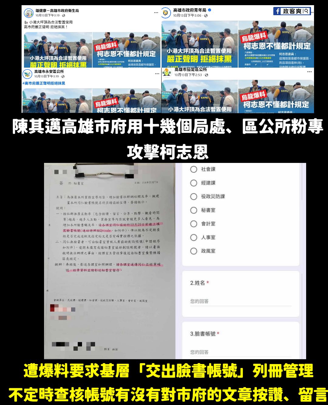 厲害了陳其邁領導的高雄市府,用局處跟區公所的粉專攻擊特定政敵本來就很糟糕了,結果還要求公務員交出臉書帳號管理。