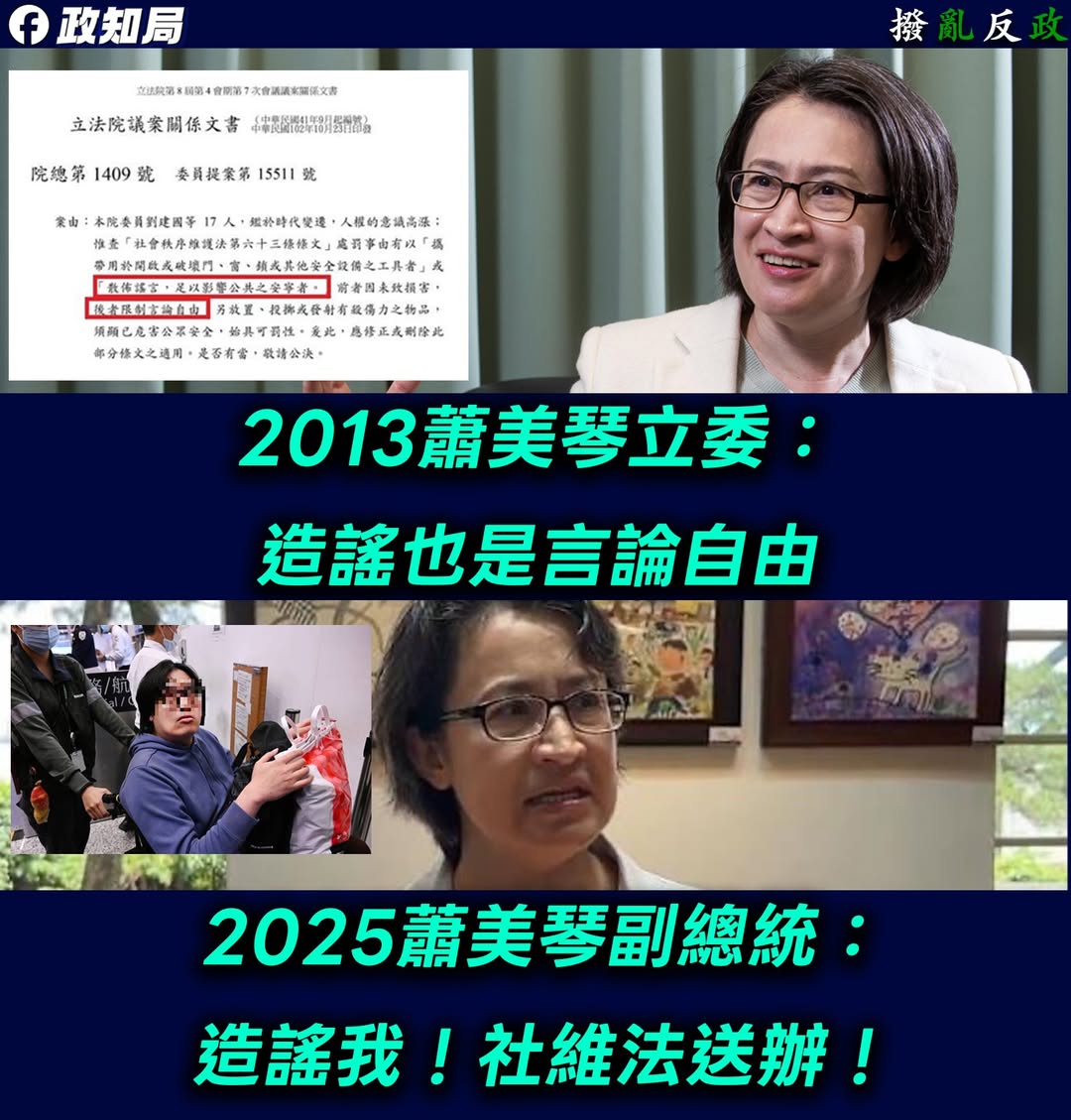 2013側翼造謠抹黑馬英九,蕭美琴提案「造謠是言論自由」。2025網友造謠蕭美琴,依社維法送辦。