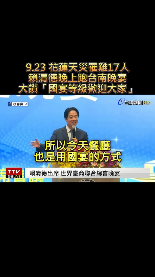 9.23 花蓮天災罹難17人,賴清德當天晚上跑台南晚宴大讚:「國宴等級歡迎大家」