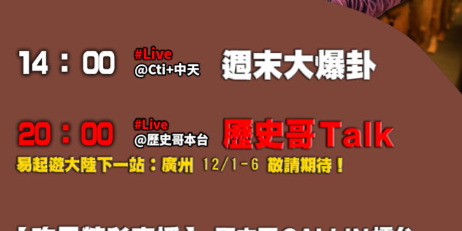 閱讀更多 »【11/30 (日)歷史哥李易修忙什麼?】 ⭐️14:00【中天直播:周末大爆卦】 ⏩https://youtube.c …