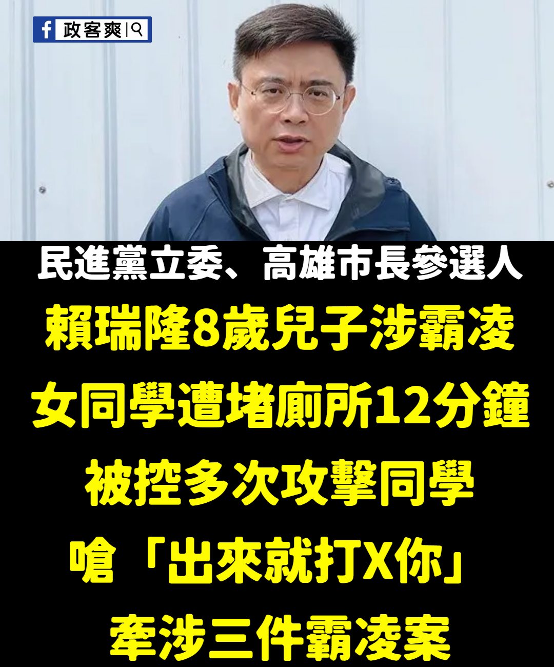 WOW,如果賴瑞隆當上高雄市長,他兒子就可以變超級學校霸王了 八歲就霸凌同學,我覺得家長的教育恐怕影響很多吧,老爸在立法院打架給全台灣看,是非常不好的身教。 轉載來源
